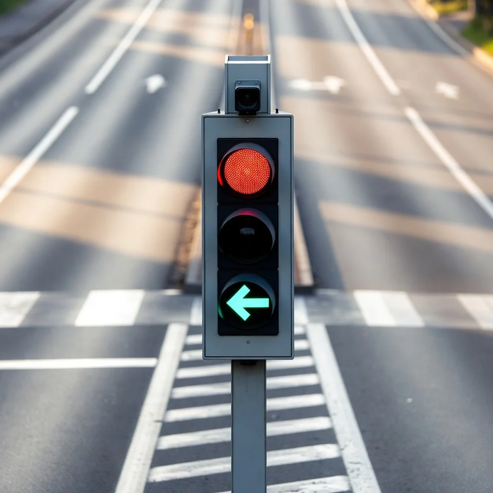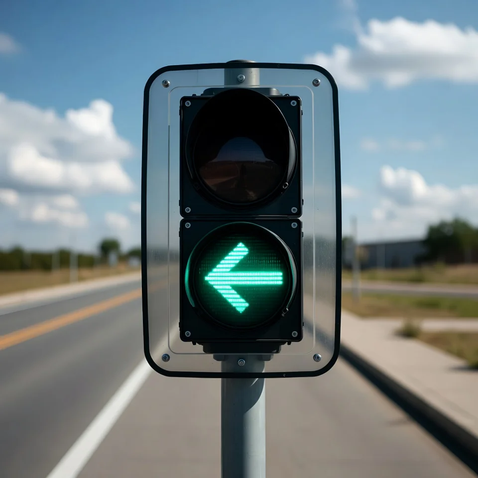 Une flèche verte orientée vers la gauche et placée seule à la sortie d'un carrefour, signifie que la circulation venant en sens inverse sur la chaussée que les conducteurs qui tournent à gauche s'apprêtent à quitter, est arrêtée par un feu rouge afin de faciliter l'évacuation du carrefour.